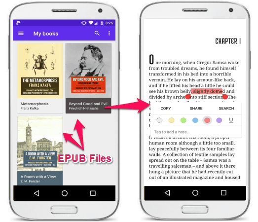 The most popular type of ebook format is epub and this simple app lets you read epub books. There are some other features as well such as text highlighting, automatic book detection, night mode, sepia mode, and Material Design. Moreover, there is a pro mode for $1.99 which as one addition. About the only difference is the ability to set custom themes. That includes the text, background, and link colours. It’s a solid option, but only if your library is already in epub format.